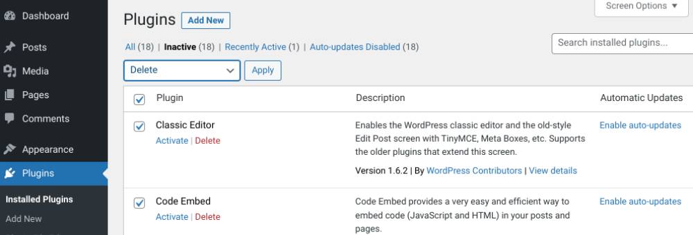 我们还建议删除任何未使用的主题或插件。您可以通过导航到插件->已安装插件->已启用来完成此操作。