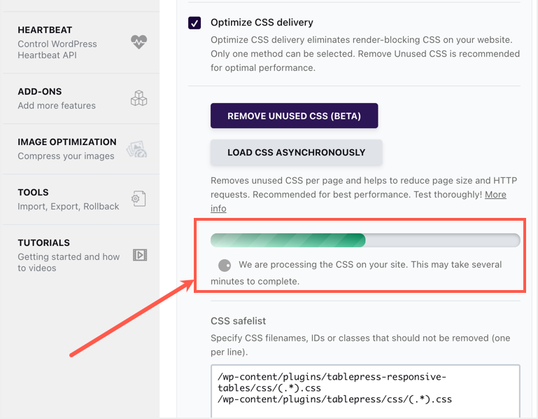 您可以选择“删除未使用的CSS”按钮并向下滚动到底部以保存更改。现在,该过程将运行并显示一个进度条,如下所示。