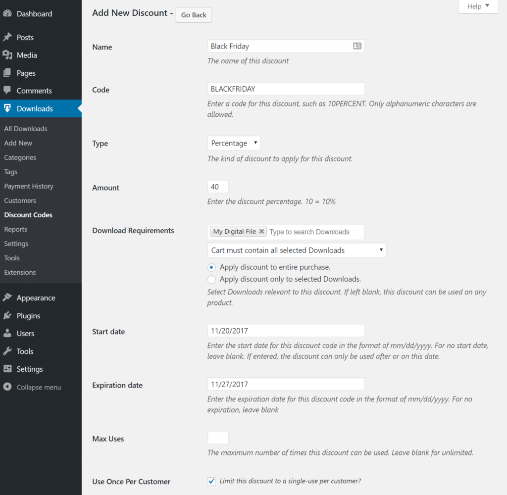 想为黑色星期五创建折扣代码吗?没问题。只需点击“下载”下的“折扣代码”,然后根据需要创建任意数量的优惠券和折扣代码。您可以选择产品的百分比折扣或统一费率金额。你可以设置有效期,甚至限制每位顾客只能使用一次。利用EDD不时推销来改进你的产品是非常容易的。