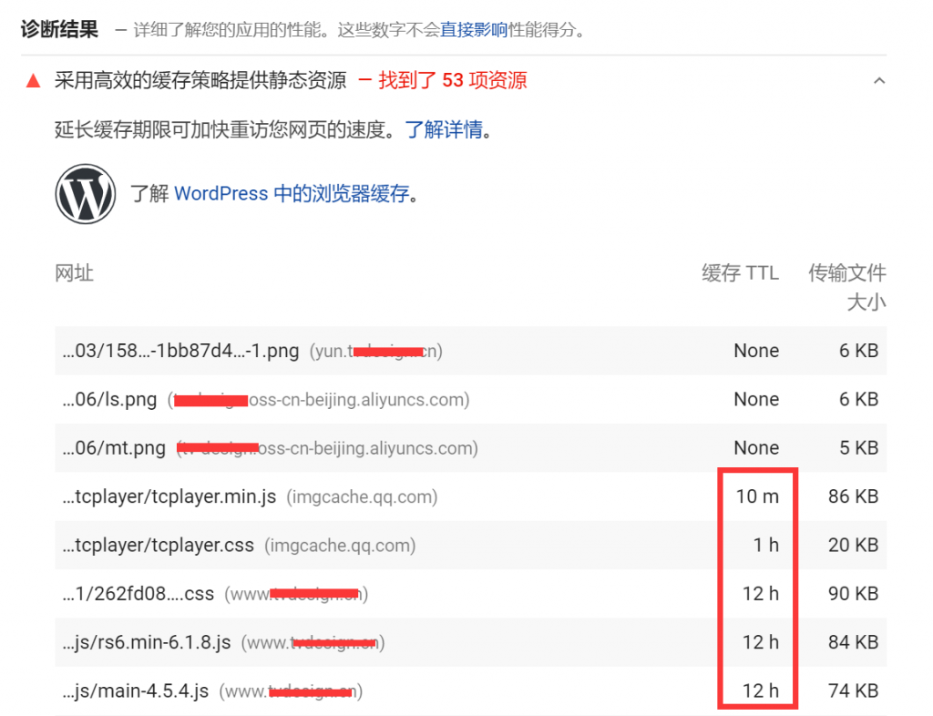 或者缓存有效期过短,最新版本的Google PageSpeed Insights会被列入“为静态资源提供高效缓存策略”的警告列表,但是“缓存TTL”显示的是缓存有效期: