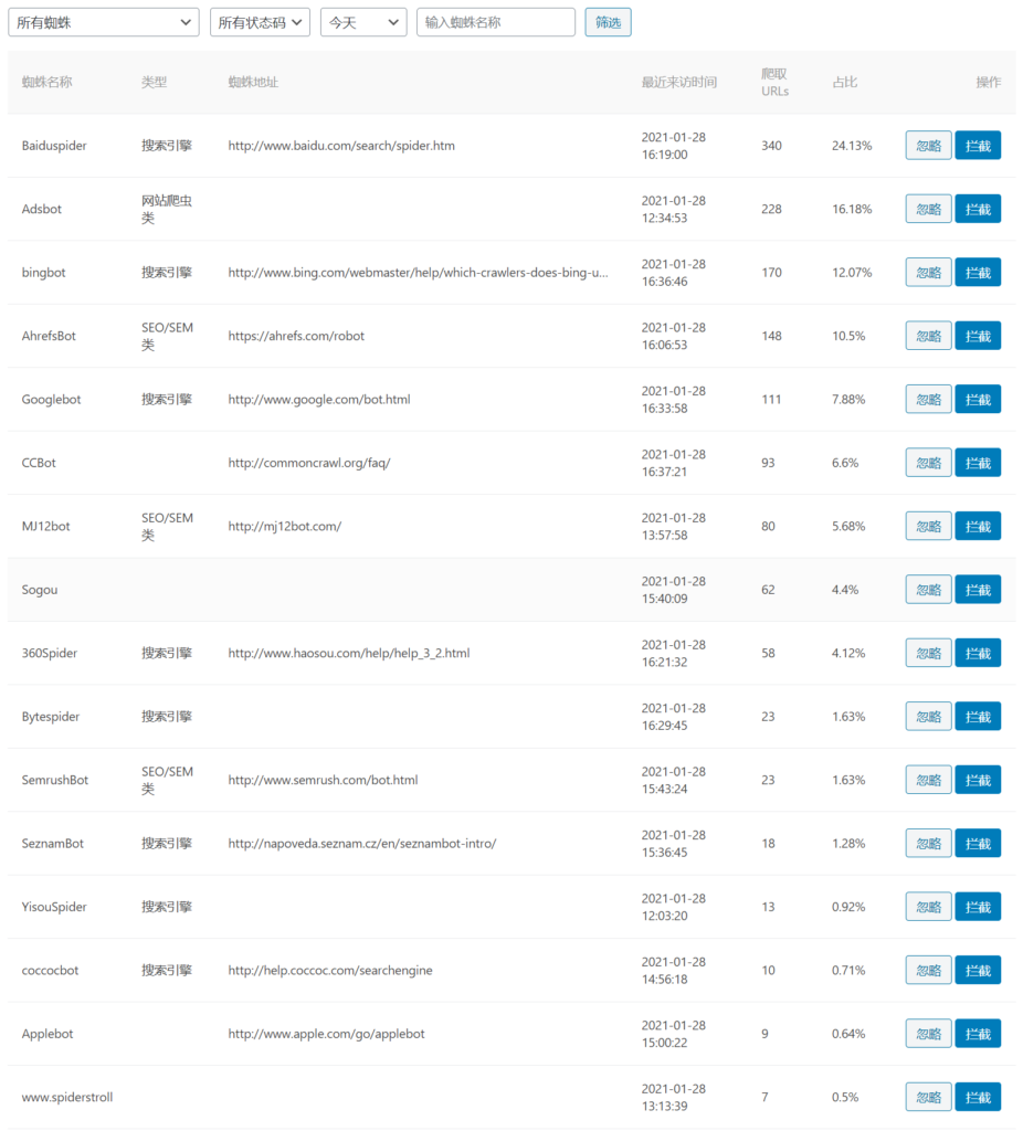 蜘蛛分析器网站管理员工具插件是基于准确验证哪些网址已被搜索蜘蛛抓取的能力。