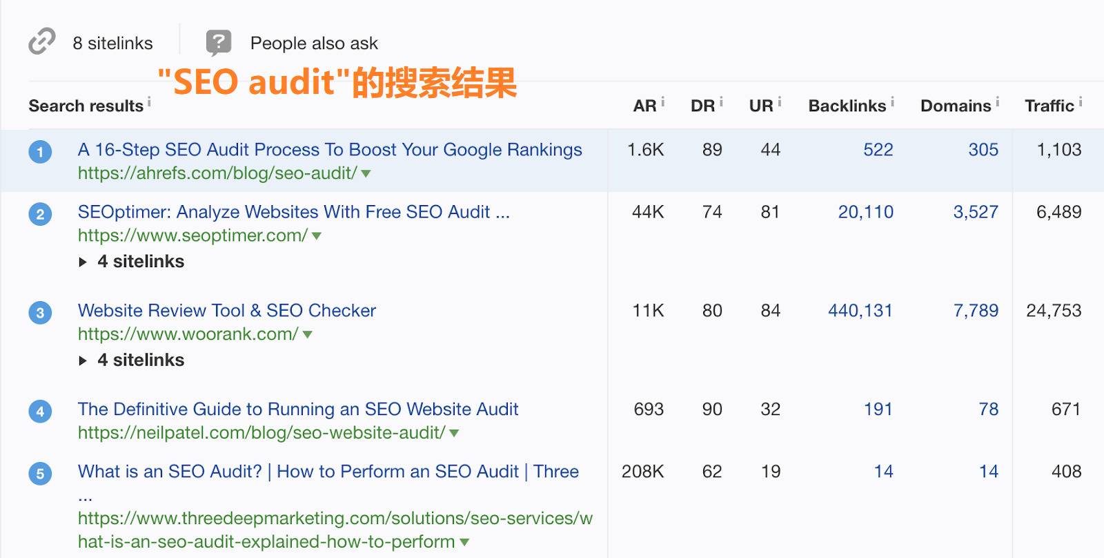 译者注:关键词“SEO audit”的搜索结果概述显示,排名第一的链接是Ahrefs的网站。