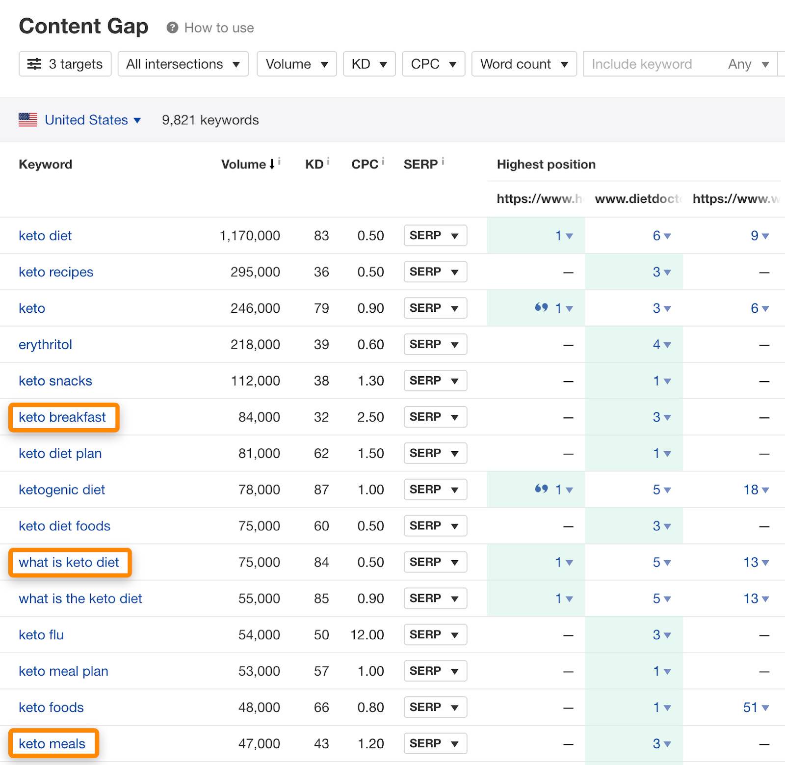 在这里,我们看到像“什么是酮饮食”、“酮餐”和“酮早餐”这样的词和短语。