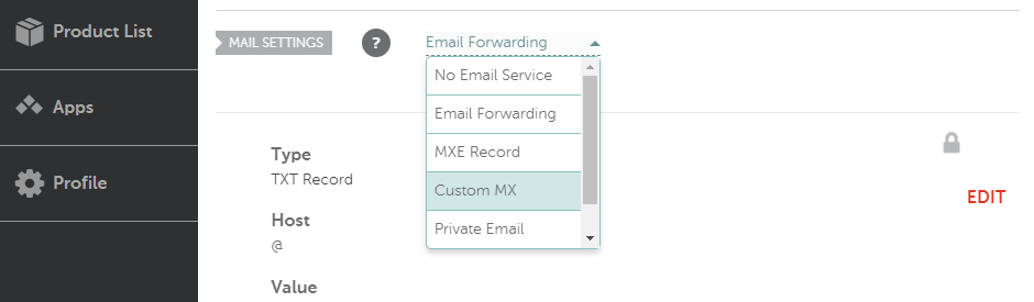 如果您向下滚动到“邮件设置”部分,您可以通过从右侧的下拉列表中选择“自定义MX”选项来添加自定义MX条目: