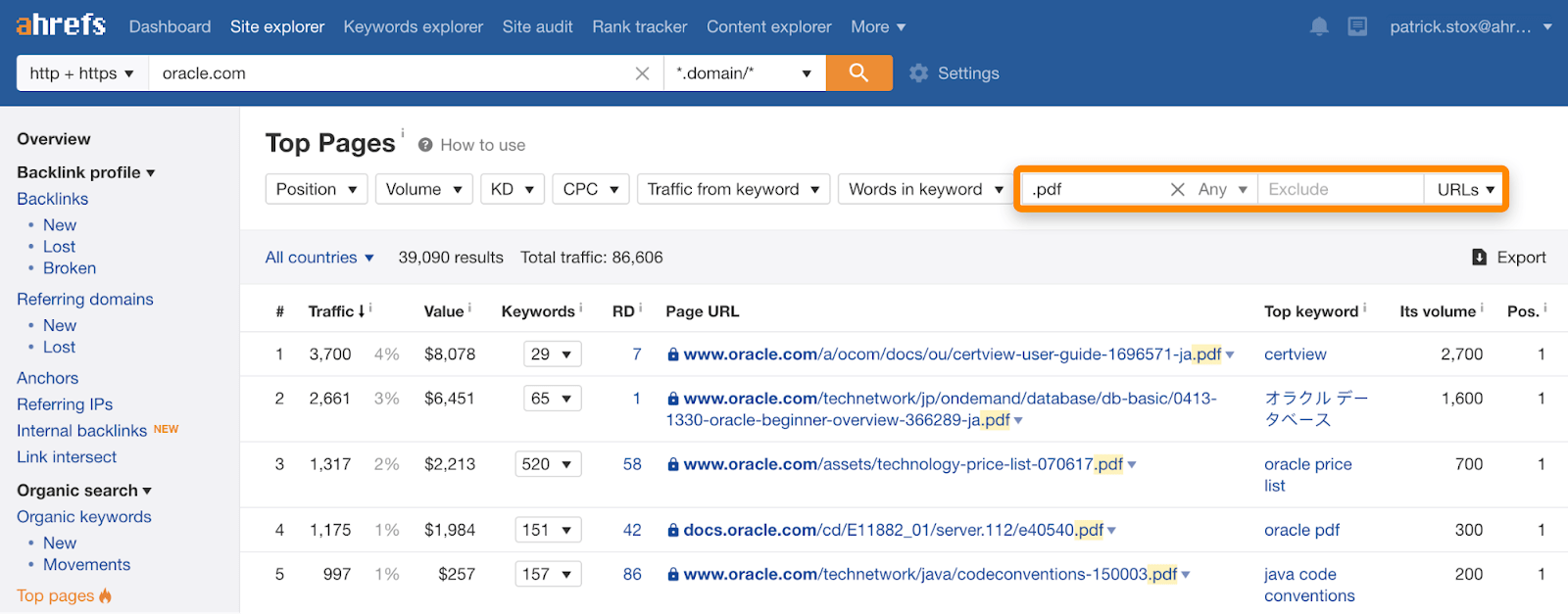 译者注:打开Ahrefs,点击导航栏中的web analytics,在输入框中输入想要搜索的网站的域名。点按边栏中的Top Pages,在搜索菜单中选择“任何”,然后输入包含“”的页面。pdf”。