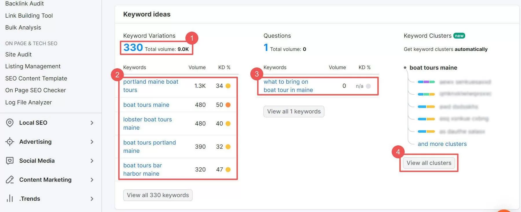 在 “Keyword Overview” 页面的更下方,您将看到更多深入分析,例如关键字变体、与关键字相关的问题以及潜在的关键字群(付费)。通过这些详细信息,您可以探索各种变体和相关术语。