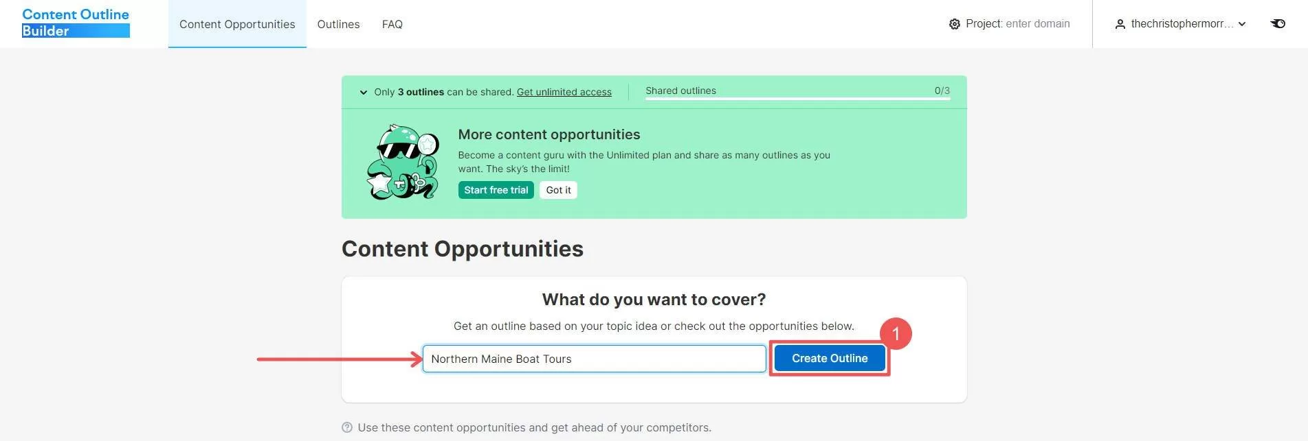 Semrush Outline Builder 是 Semrush 最简单易用的人工智能工具。您最多可以免费使用和共享三个大纲。开始时,请提供一个您想讨论的主题。我们正在为缅因州的一家游船公司制作主页。我们用博客文章、主页和登陆页面对该工具进行了测试,结果显示它在每种情况下都表现出色。点击 “Create Outline“。