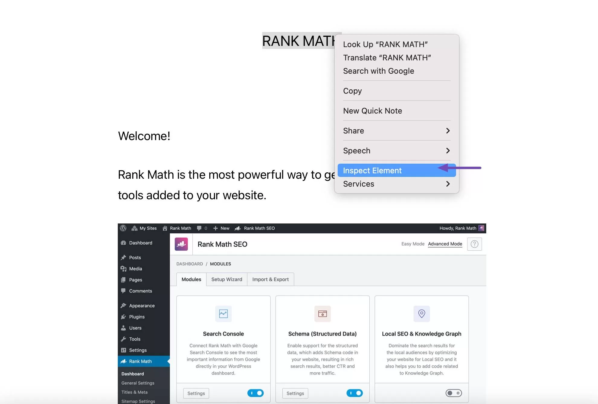 要识别页面的CSS类,请右键单击页面标题元素,然后选择“检查”或“检查元素”,如下所示。