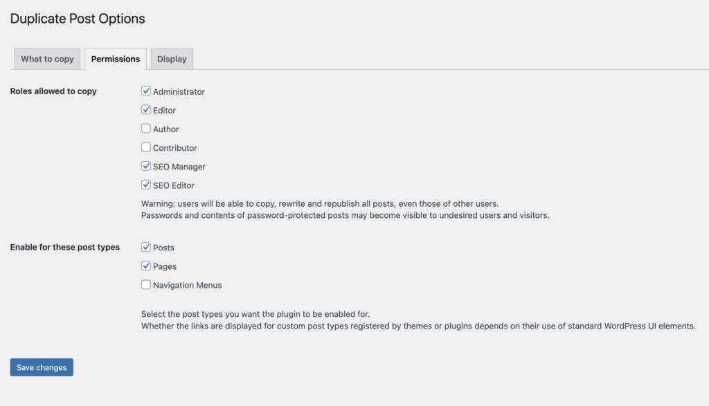 权限选项卡允许您控制谁可以在 WordPress 网站上复制文章。默认角色可能是最好的,但如果您想在自定义文章类型上启用复制文章,也可以在此页面上进行操作。例如,如果你想复制 WooCommerce 产品。